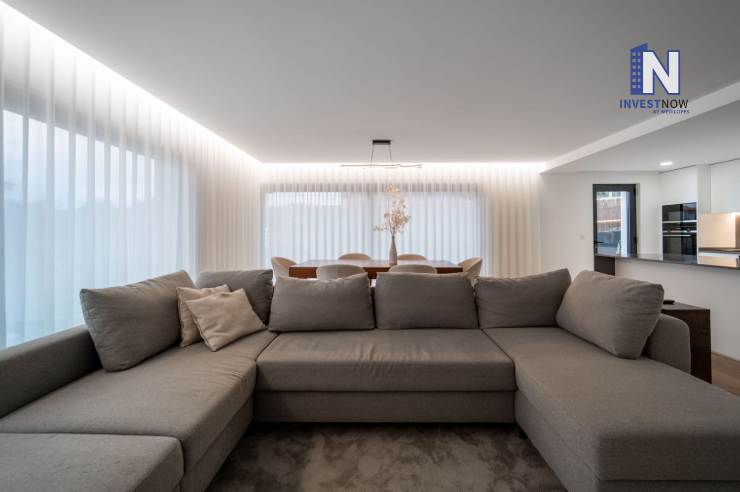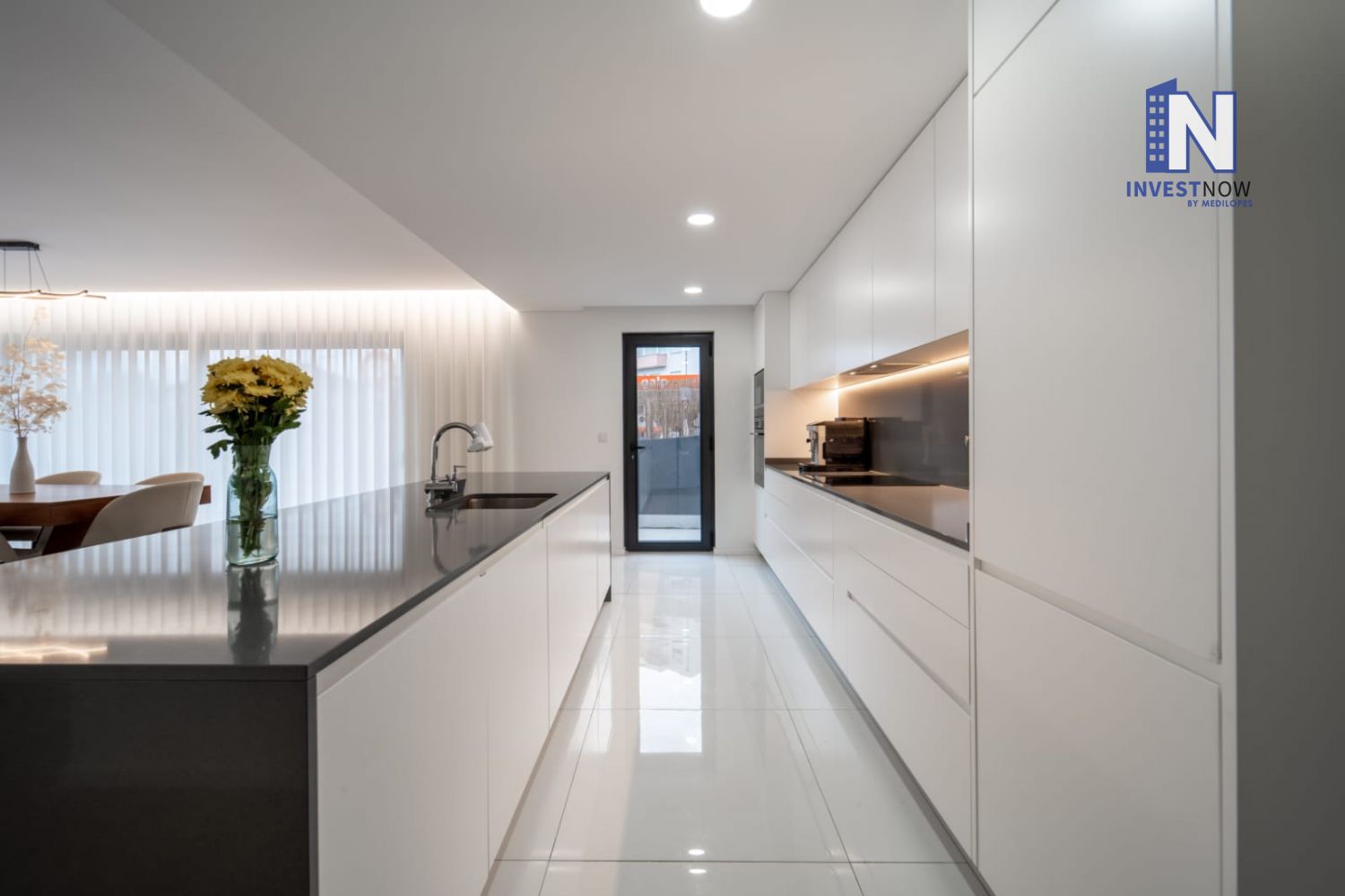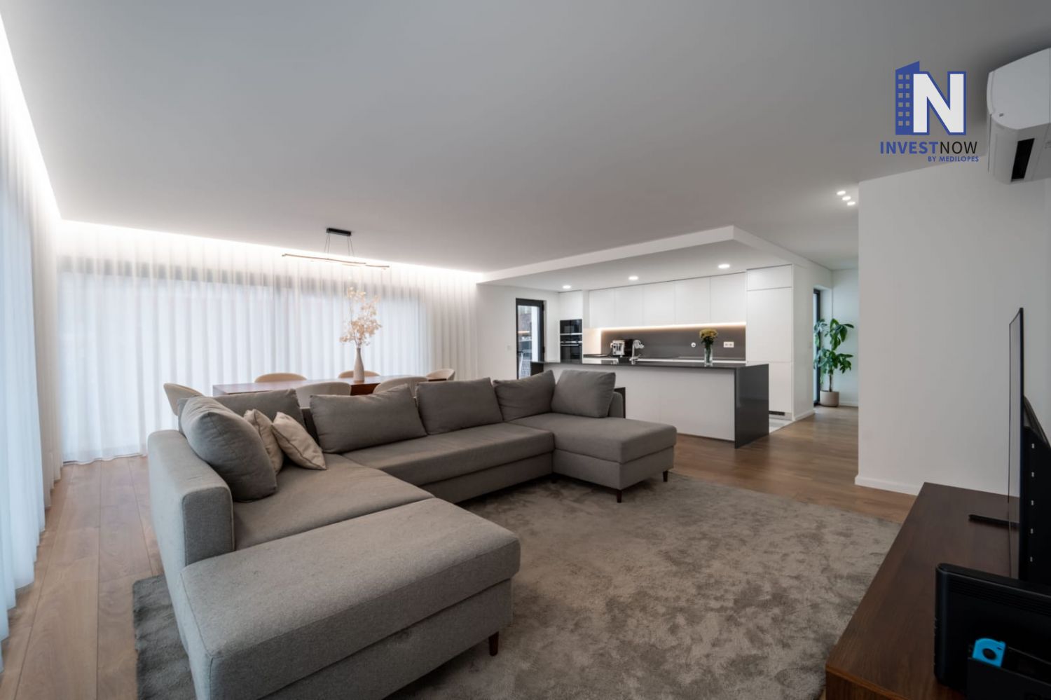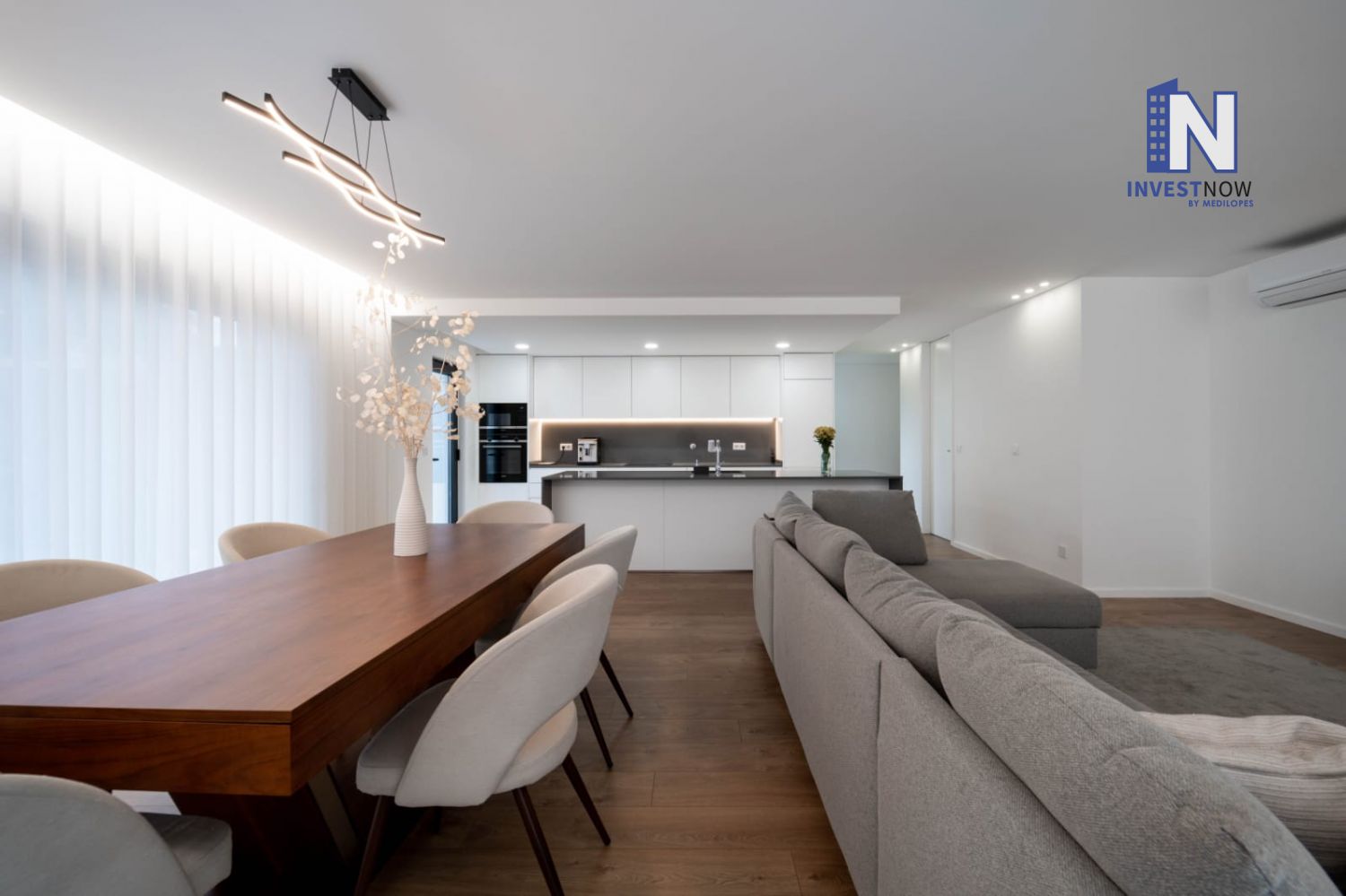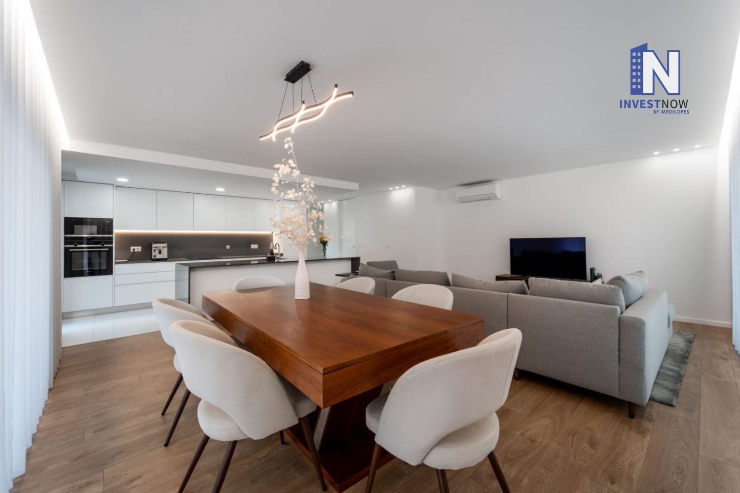 Com 137 m² de área útil, o apartamento encontra-se no primeiro andar e apresenta um excelente estado de conservação. A sala é ampla e luminosa, com acesso direto a um terraço privativo perfeito para momentos de lazer ao ar livre. A cozinha, moderna e totalmente equipada, foi pensada para o dia a dia e integra-se harmoniosamente com o restante espaço.